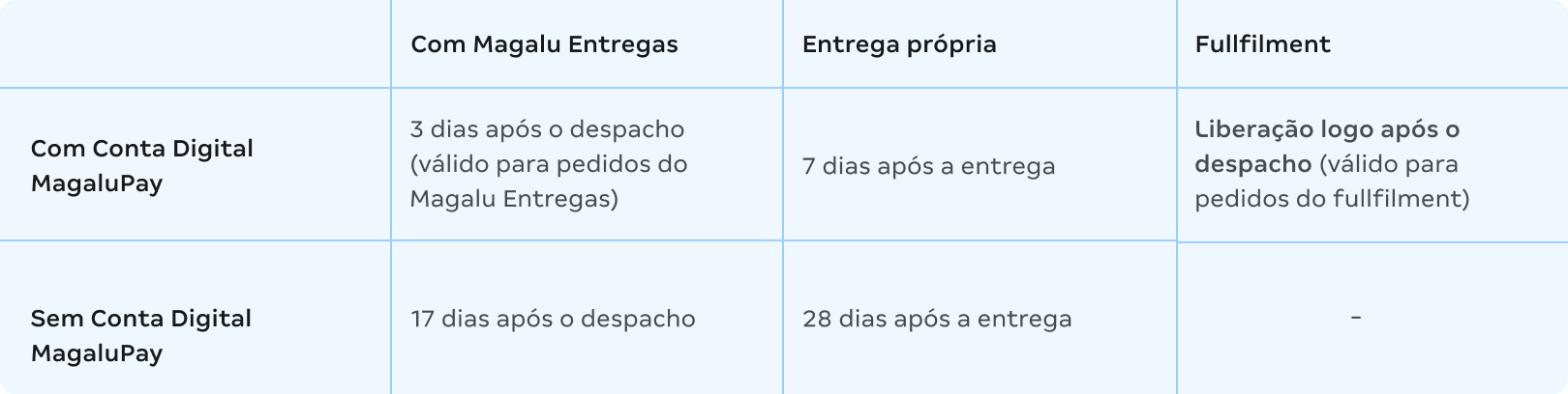 - Como o vendedor utiliza a Conta Digital MagaluPay e o fullfilment, o desbloqueio do recebível será feito logo após o despacho.