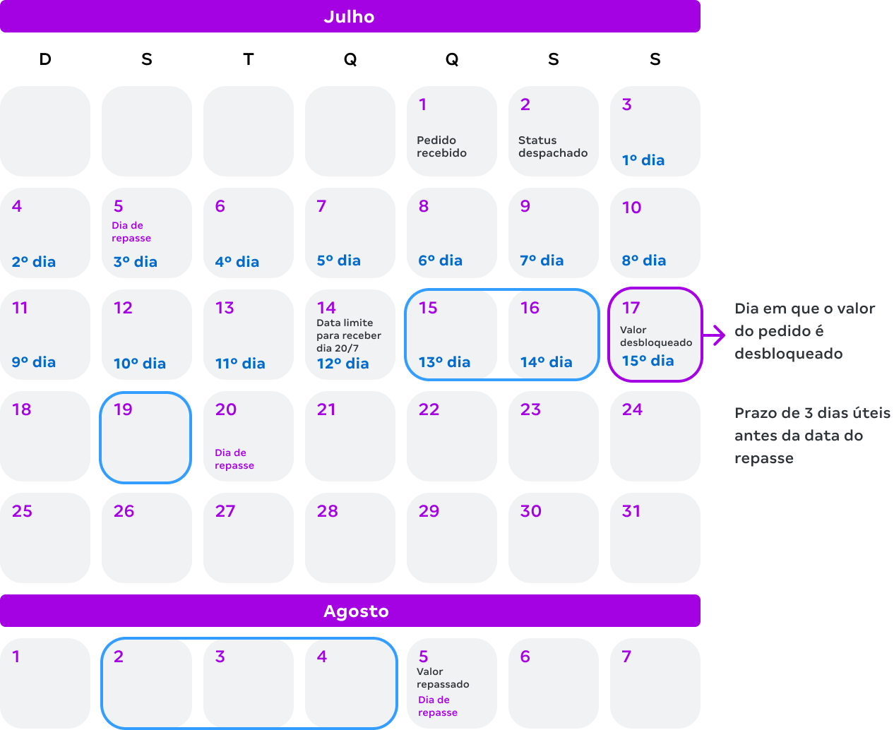 Vamos imaginar que você recebeu um pedido no dia 01/07 e ele foi atualizado para o status ”ENVIADO” no dia 02/07. O saldo será desbloqueado no dia 17/07, conforme o calendário abaixo: