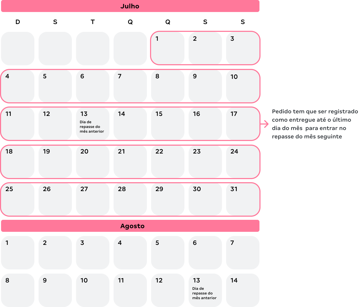 Se, por outro lado, o pedido fosse entregue e registrado após o dia 31 de janeiro, ele não seria incluído no repasse de fevereiro. Nesse caso, o desbloqueio do recebível ocorreria apenas no repasse de março, realizado no dia 13 de março.